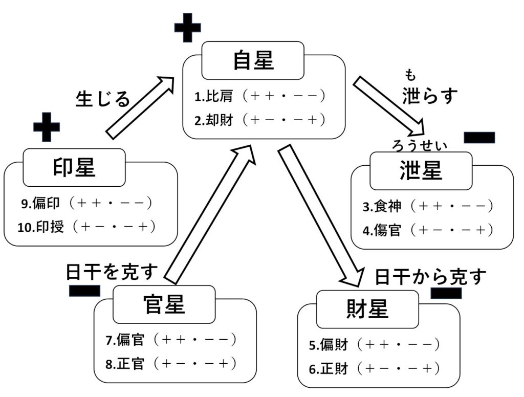 その他、相生関係や相克関係にある通変星も同様に記号で表しています。